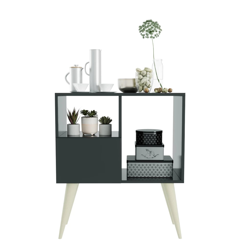 Sua porta única revela um bom espaço de armazenamento, enquanto os dois nichos abertos oferecem um toque decorativo e prático.